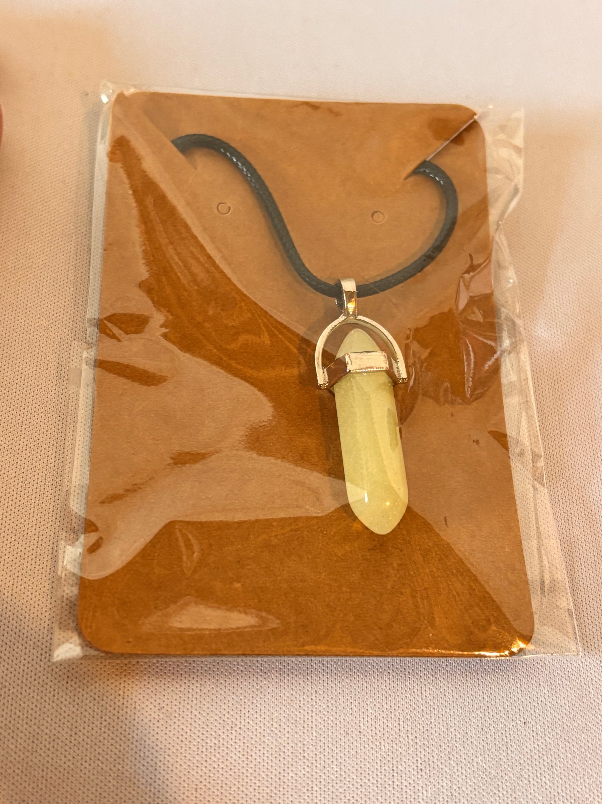 This handmade necklace features a crystal-like stone that glows in the dark, combining natural elegance with a captivating luminous effect. Expertly crafted, it offers a unique accessory that stands out both day and night, perfect for those seeking a subtle yet striking statement piece.